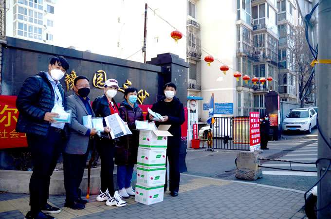 11时,顺义区赵全营镇解放村支部书记张金龙和社区的社工们接受捐赠的2000个医用口罩和护目镜。